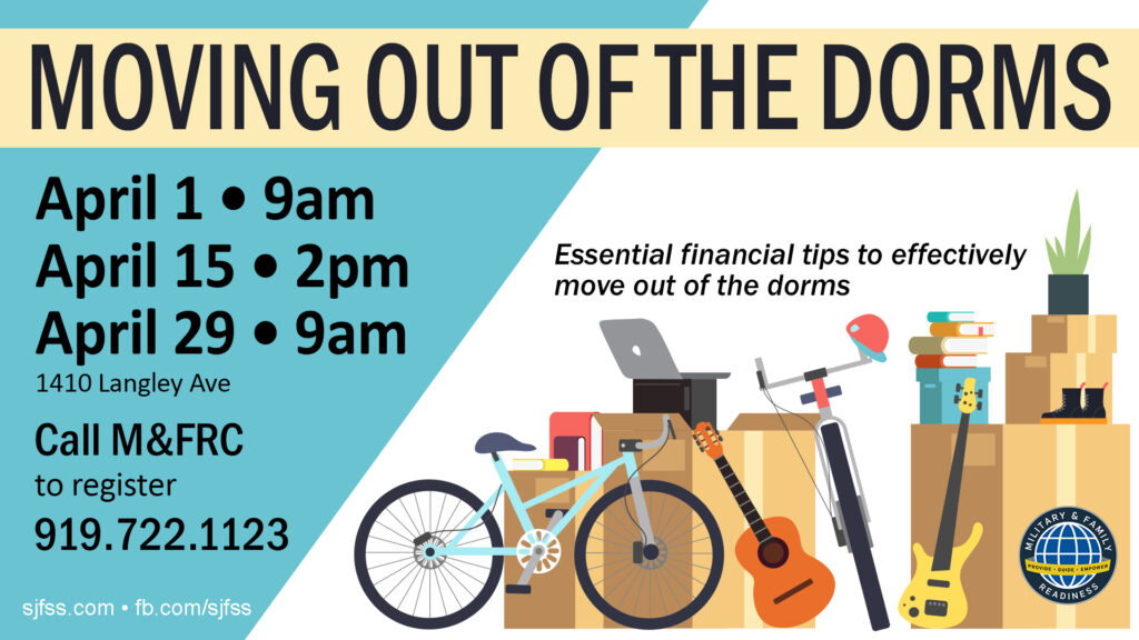 Topics include choosing where to live, considering a roommate, the application process, understanding the lease agreement, how to set up housekeeping, and budgeting. Airmen will develop a budget reflecting their new financial obligations. Call 919-722-1123 to sign up.