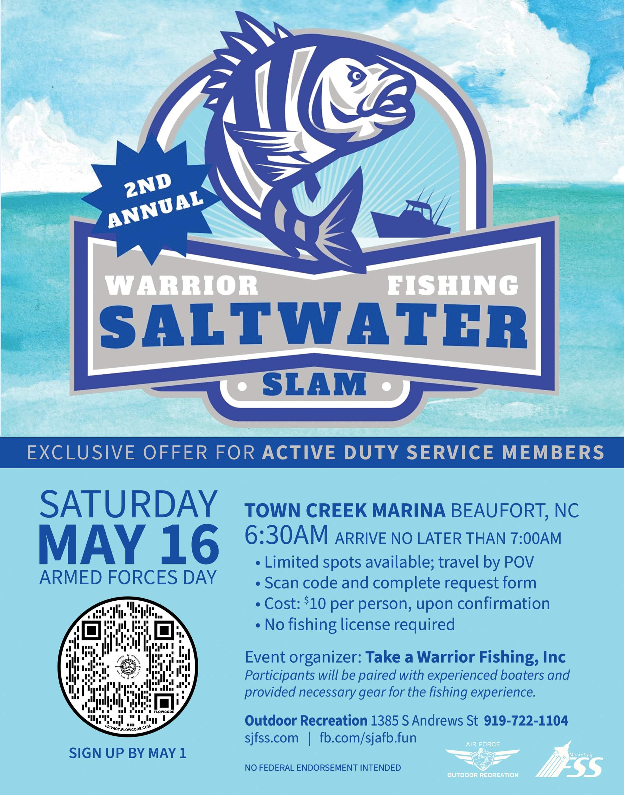 The Take a Warrior Fishing Saltwater Slam is an exciting opportunity for base Airmen (all ranks). All equipment and lunch is provided. No fishing license needed. Participants will need to arrive at Town Creek Marina in Beaufort, NC by 7AM on 5/16. Participants will simply show up to the marina, get signed in, be assigned a boater, and fish!