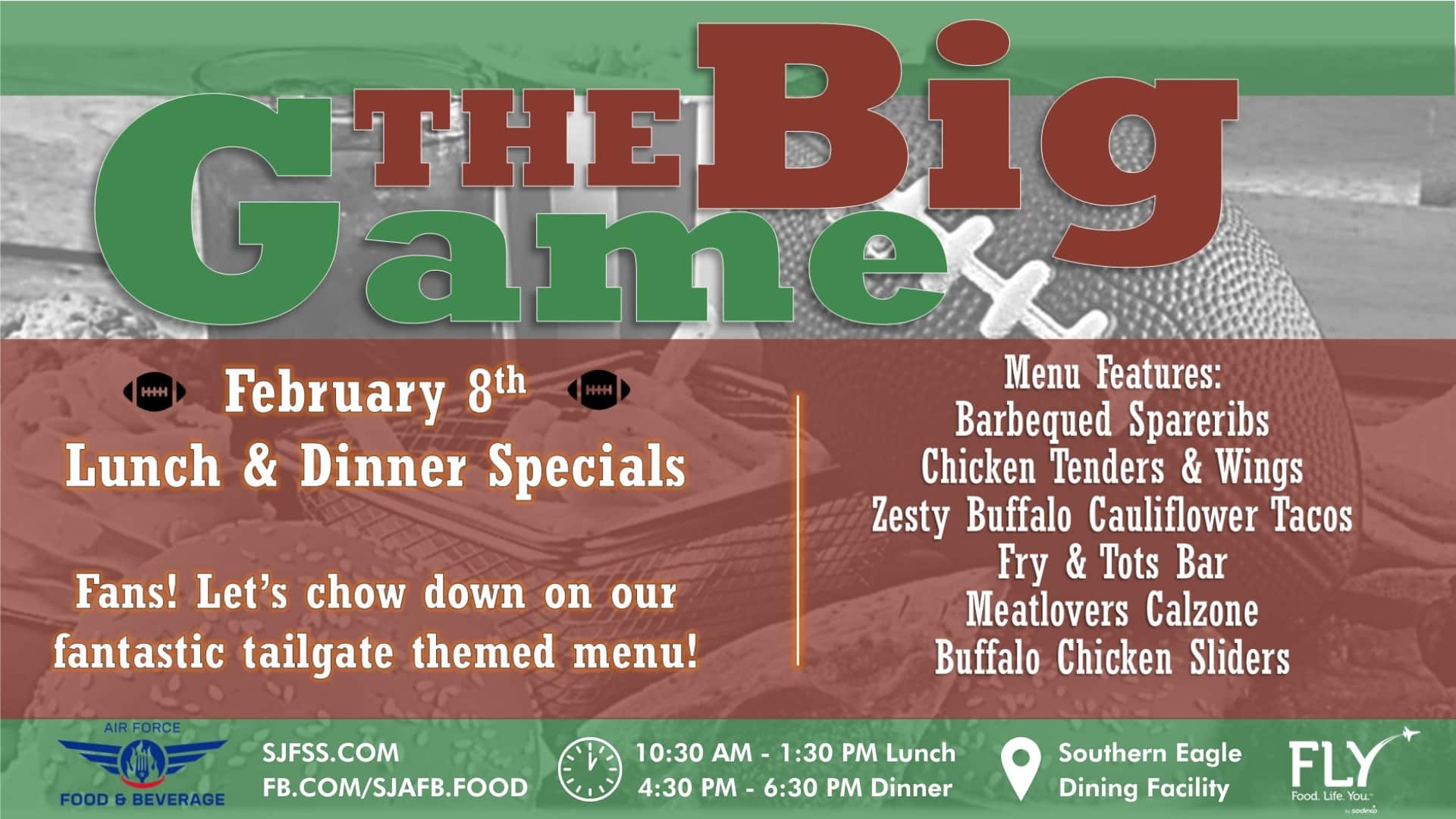 Big Game Special February 8 @ 10:30 am - 6:30 pm Southern Eagle Dining Facility 3650 Pope St, Goldsboro, North Carolina, United States